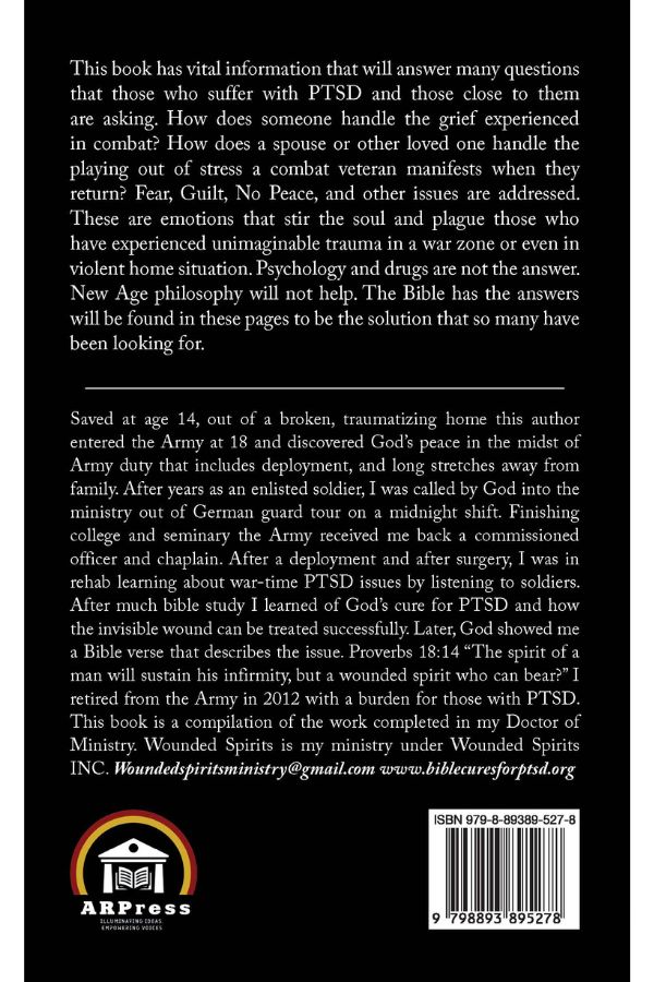 Biblical Cures for the Wounded Spirit contains vital information that will answer many questions that those who suffer with PTSD and those close to them are asking. How does someone handle the grief experienced in combat? How does a spouse or other loved one handle the playing out of stress a combat veteran manifests when they return?
